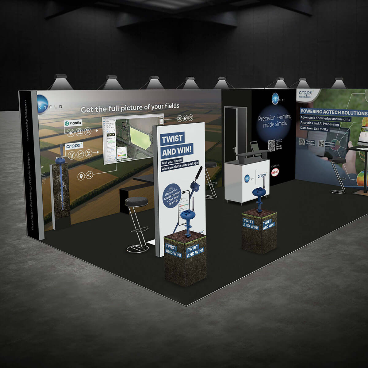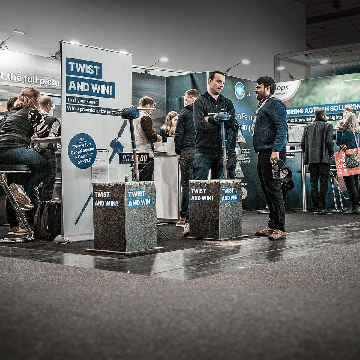 Zentraler Anlaufpunkt des gemeinsamen Messestandes von SKYFLD und CropX war ein originelles Gewinnspiel. Besucher*innen wurden eingeladen, ihre Muskelkraft unter Beweis zu stellen, indem sie einen Bodensensor in einen mit Erde gefüllten Container bohrten. Als Belohnung winkte ein attraktives Preis-Bundle.